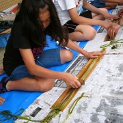 カラムシの皮を剥ぎ、きれいにおかきした植物繊維は、アンギン編みの素材になります。